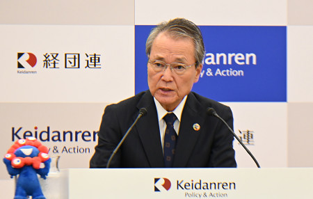 記者会見する経団連の筒井義信会長。自民党の高市早苗総裁の就任を受けて日経平均株価が一時4万8000円台に上昇したことについて、「期待の表れだ」と評価した=6日午後、東京都千代田区 【時事通信社】
