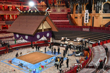 大相撲のロンドン公演は15日(日本時間16日)からロンドン中心部のロイヤル・アルバート・ホールで5日間の日程で行われる。13日には土俵づくりが進められ、準備は大詰め。 【時事通信社】