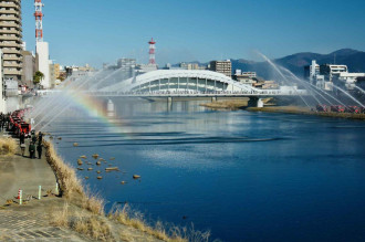 狩野川の河川敷で行われた一斉放水