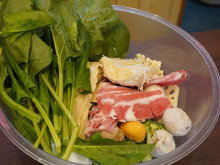 ショーケースに並ぶ牛肉や鶏肉、ラム肉、魚介類、野菜、チーズ入りトッポギなど60種類を超える具材をバイキング方式で選び、重さで価格が決まる。具材100グラム当たり400円で、280グラム以上から注文できる。スープは薬膳スープ(ピリ辛・中辛)または濃厚トマトスープから選ぶことができる。「辛さゼロ」「辛さマックス」などのアレンジにも応じる。新鮮な野菜を毎朝市場で仕入れ、スープは毎朝仕込んでいるという。