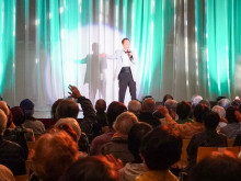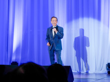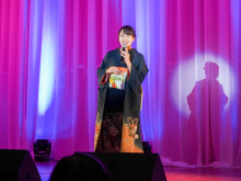 交流会には第一中学校卒業生で俳優の磯村勇斗さんがサプライズで登場。トークセッションと「生徒Q&A」、じゃんけん大会、花束と記念品の贈呈などを行った。