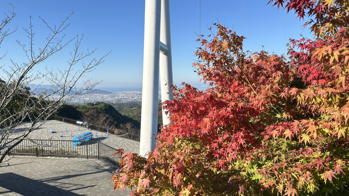 紅葉が見頃を迎えた観光施設「三島スカイウォーク」(三島市笹原新田)で11月中旬、同施設つり橋から紅葉と空の広がりを望む「空紅葉(そらもみじ)」の季節が始まった。
