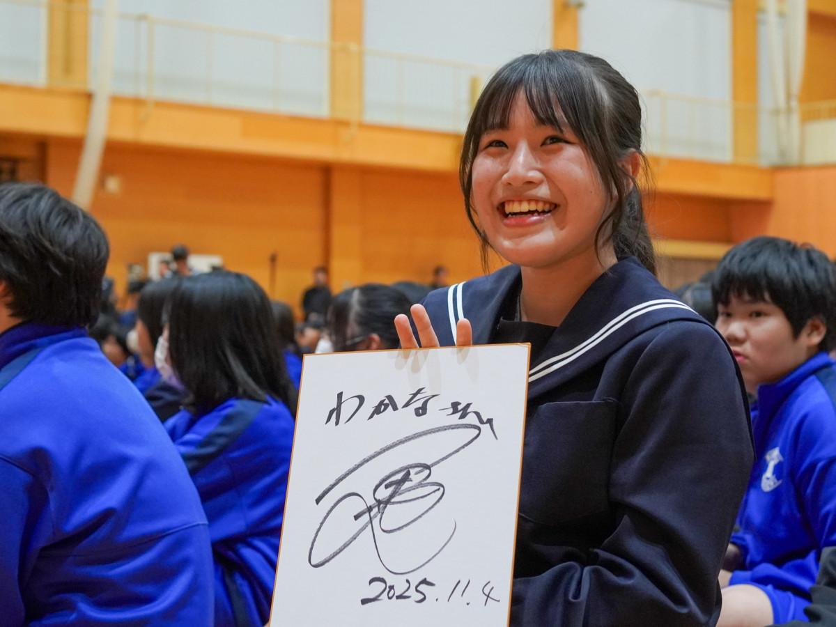 じゃんけん大会で勝ち磯村さんから色紙をもらった小野田和奏さんは「目を見て話してくれてうれしかった」と話していた