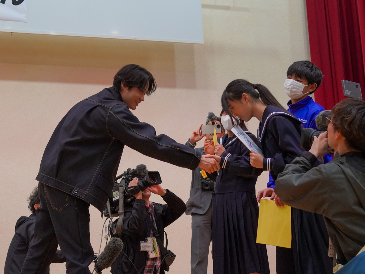 じゃんけん大会で勝った生徒と握手する磯村さん(左)