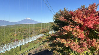 紅葉が見頃を迎えた観光施設「三島スカイウォーク」(三島市笹原新田)で11月中旬、同施設つり橋から紅葉と空の広がりを望む「空紅葉(そらもみじ)」の季節が始まった。