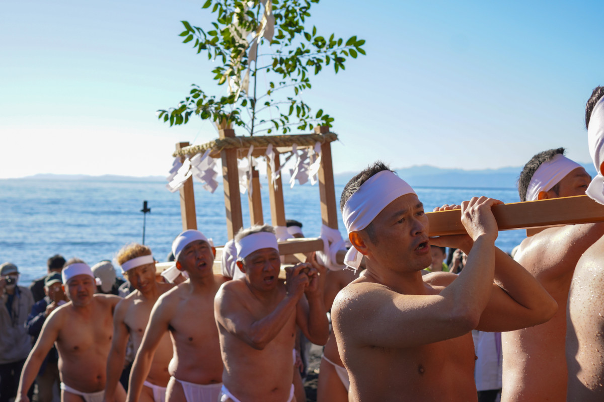 「厳冬海中みそぎ祭り」が1月12日、牛臥山公園(沼津市下香貫)内の小浜海岸で行われた。