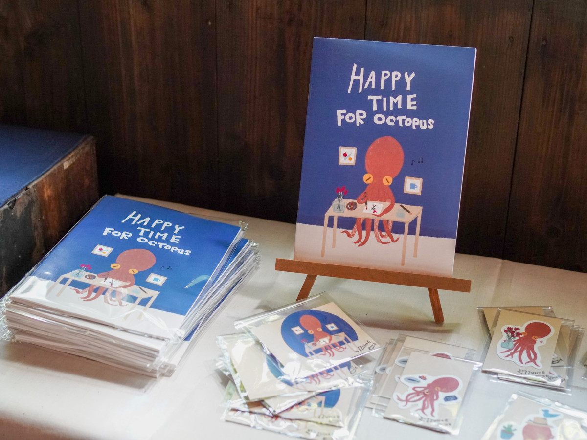 擬人化したタコの日常生活を描き英語の解説を添えた本「HAPPY TIME FOR OCTPUS」