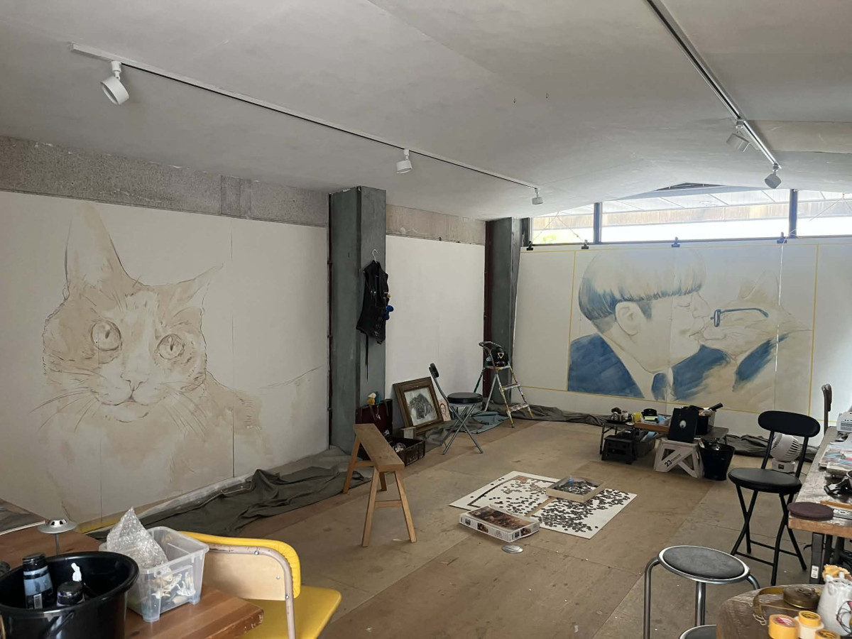 沼津在住のイラストレーター・マツナガマサエさんによるライブドローイング「チャトランの壁 神よ、このplaceで我(われ)を生き延びさせ給(たま)え!」が現在、自家焙煎(ばいせん)コーヒー店「チャトラコーヒー」2階のギャラリー「チャトラ『プレイス』」で開催されている。