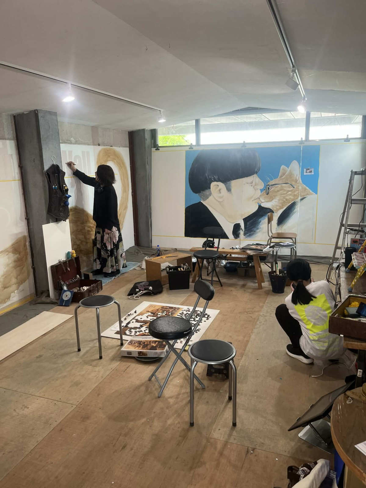 「ゆっくり時間がある人は1階でドリンクをオーダーしておいしいもの飲みながら座って鑑賞してほしい」と話すマツナガマサエさん = 沼津でライブドローイング「チャトランの壁」 コーヒーで描く公開制作