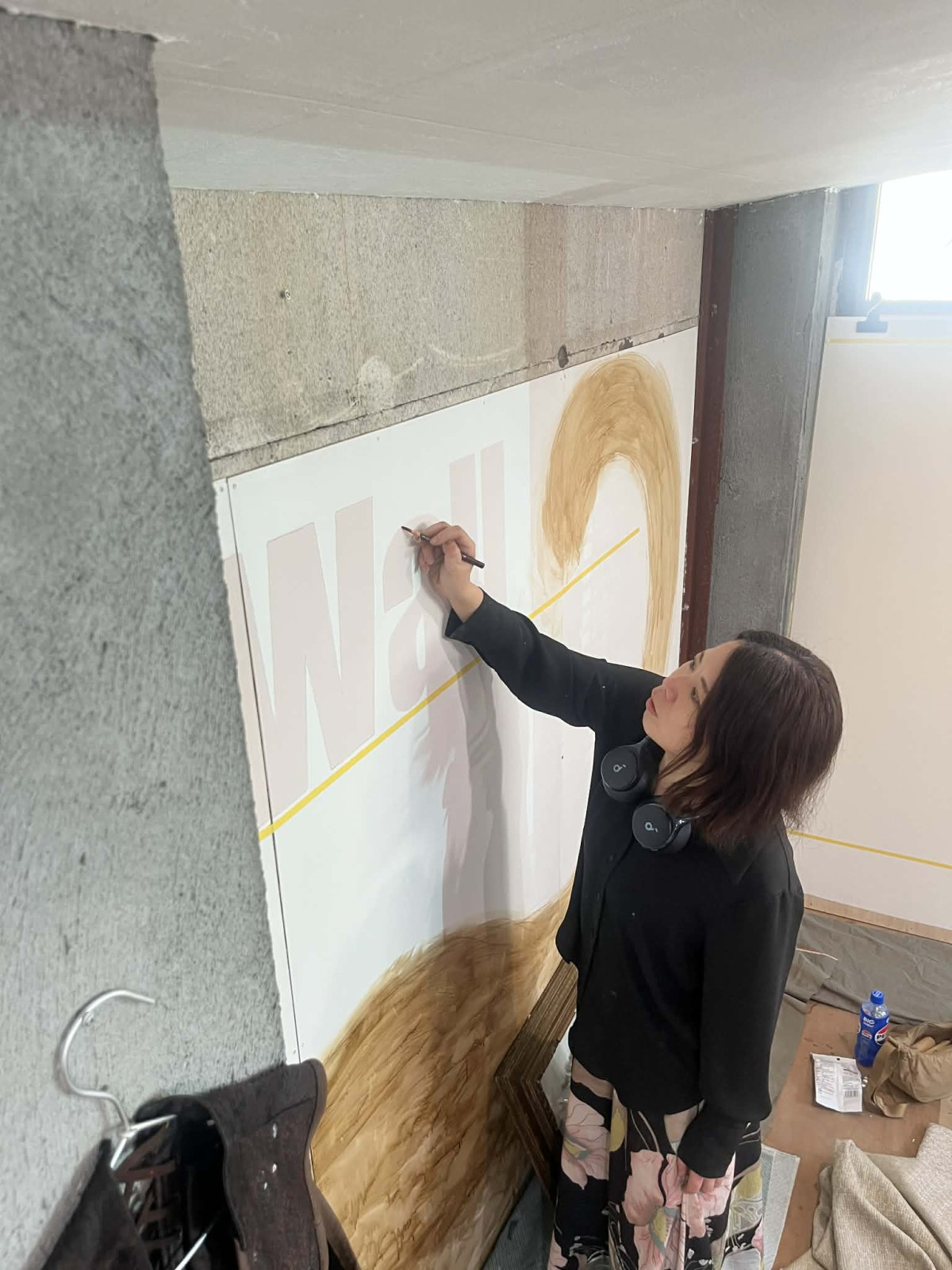 「日に日に変化していくので、来るたびに写真を撮ると面白いと思う」と話すマツナガマサエさん = 沼津でライブドローイング「チャトランの壁」 コーヒーで描く公開制作