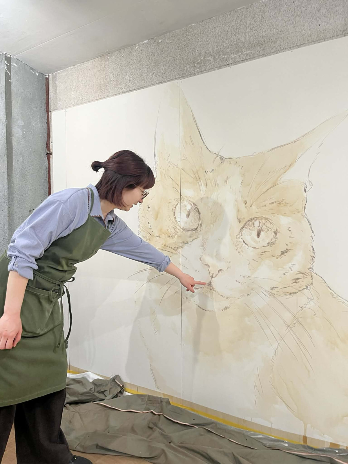「チャトラコーヒー」パティシエの市川真帆さん(左)の実家の三毛猫・三池さんが描かれている= 沼津でライブドローイング「チャトランの壁」 コーヒーで描く公開制作
